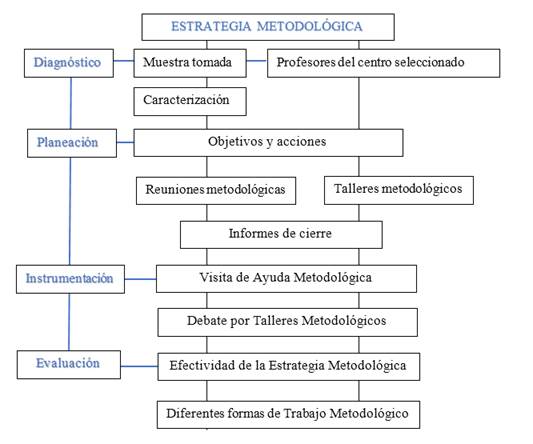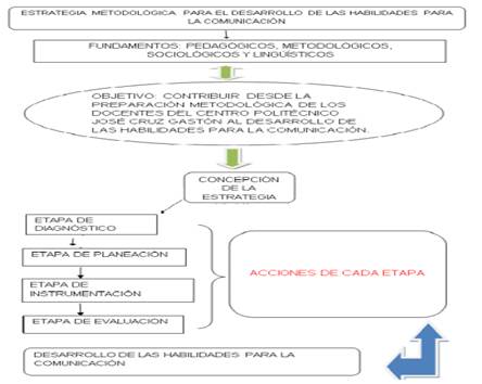 Los principales referentes teóricos que se han asumido hasta el momento acerca de las habilidades para la comunicación, han sido seleccionados en correspondencia con las acciones que se deben ejecutar en el trabajo metodológico como una función orientadora a docentes de diferentes especialidades y niveles educativos, pues se considera el estudio del Reglamento (Cuba. Ministerio de Educación, 2014a), siendo este el documento rector, cuyo objetivo, los profesores actuales que asumen la docencia en áreas de especialización de la Educación Técnica y Profesional, obtengan calidad y ganancia metodológica en sus preparaciones para enfrentar en el proceso de enseñanza-aprendizaje. Precisamente, el autor presenta una estrategia metodológica (figura 1) y su validación práctica (figura 2).