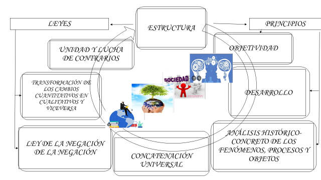 Es necesario, además de los criterios expuestos, declarar, como se explicitó en la introducción de este trabajo, la necesidad de subrayar elementos esenciales de la estructura científico-metodológica de la dialéctica-materialista y su empleo en la formación investigativa de los profesionales en su ejercicio, tanto en pregrado como en postgrado. Ejemplo de ello es son sus principios, leyes y categorías como se muestra a continuación en los esquemas siguientes: