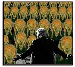 La que se analiza, es un montaje que usa la obra multiplicada -de ahí el título – y una fotografía de la prensa de Trump, en actitud agresiva y prepotente, con las manos abiertas para expresar que el hecho de su elección como Presidente de los EEUU es cierto. Algo así como: ¿no lo creen? Es importante observar el juego de los colores, las luces y las sombras, el foco intencional de la imagen y la originalidad de la repetición de una imagen como símbolo de sorpresa e incredulidad.