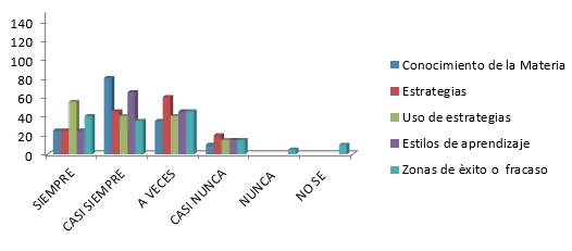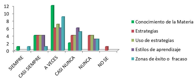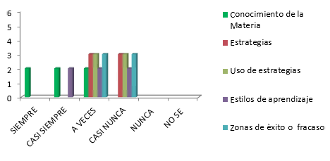 En general los datos revelados en el gráfico permiten señalar que, de acuerdo con el criterio de los estudiantes, hay cierta sobre valoración de la dimensión cognitiva en el desarrollo del proceso de aprendizaje más consciente para así potenciar el mismo, aunque reconocen que los indicadores como el conocimiento de las estrategias y su uso, así como, el conocimiento de los etilos de aprendizaje y el conocimiento de sus zonas de éxito y de fracaso, también se dan a veces en ellos, por lo que alerta que una estrategia didáctica que se elabore debe contribuir a desarrollar estos aspectos en los estudiantes.