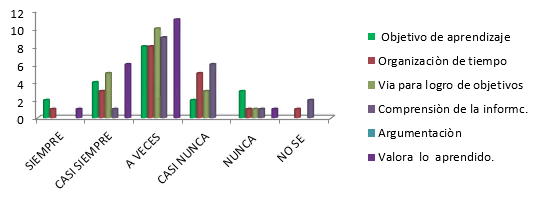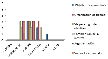 La gráfica expresa que la mayor parte de los docentes consultados consideran que solo a veces (nivel medio) los estudiantes se plantean objetivos en su aprendizaje, similar dato se evidencia sobre el hecho de valorar su aprendizaje de que no se fijan nuevas metas para el mismo. Así también, no organizan de manera adecuada su tiempo para el aprendizaje y resolver tareas.