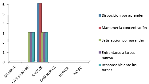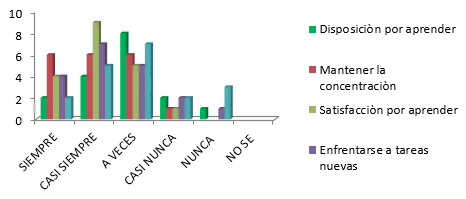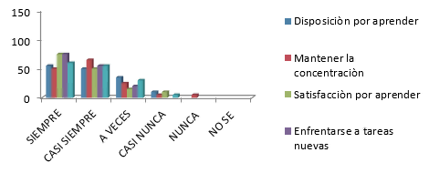 En general los datos revelados en el gráfico permiten señalar que, de acuerdo con la percepción de los docentes, los estudiantes siempre tienen disposición para enfrentar y mantener su concentración a lo largo de las tareas y lograr sus objetivos para poder desarrollar un proceso de aprendizaje más consciente para así potenciar el mismo.