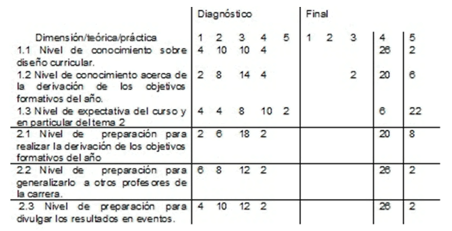 Con relación a los indicadores con mayores niveles bajos, están en la dimensión teórica, el nivel de conocimiento acerca de la derivación de los objetivos formativos del año y en la dimensión práctica el indicador 2.1 acerca de la preparación para realizar la derivación de los objetivos formativos del año con 18 profesores. Esos mismos indicadores en la etapa final fueron evaluados de muy bien con más un 85% de los encuestados