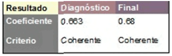Además, este software ofrece hasta qué punto los encuestados fueron objetivos en los criterios emitidos, basado en el valor del coeficiente de correlación multidimensional rpj, según se muestra, donde el valor más alto es 1.En la tabla 5 se muestra la coherencia de criterios emitido por los profesores tanto en el diagnóstico como en el final, por tanto se puede identificar objetividad en el instrumento aplicado.