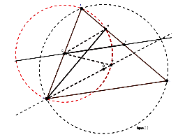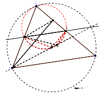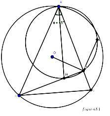 DOF. Las propiedades del circuncentro sugieren trazar los segmentos de mediatrices D0 yE0 , de donde se puede inferir que los puntos A, D, O y F pertenecen a la circunferencia de diámetro AO. Al trazar esta circunferencia todo parece indicar que también pasa por F. Las propiedades del triángulo rectángulo BHA permiten concluir que: