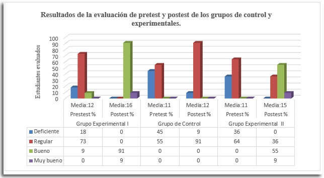 Gráfica 1. Comparación de medias y niveles de logro en postest y pretest de grupos experimentales y control.