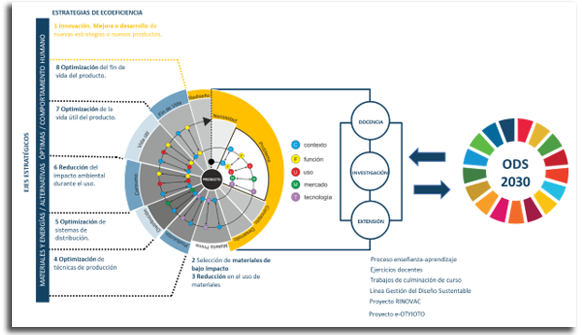 Se definió la línea de investigación Gestión del Diseño Sostenible, sustentada en la Agenda 2030. Esto establece las bases teóricas-prácticas necesarias según el factor Contexto, Función, Uso, Mercado y Tecnología para la integración de la dimensión ambiental en la actividad docente y la materialización de los resultados en las actividades de extensión de la universidad. Las interrelaciones de las actividades sustantivas del ISPH permitió la selección de los 23 temas de culminación del curso de Diseño del 2019, que por su carácter proyectual, implementaron un proceso de diseño en cinco etapas: Necesidad, Problema, Concepto y Desarrollo (Fig.2).