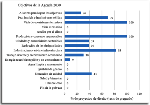El 100 % de los proyectos tuvieron en cuenta los objetivos de la Agenda 2030 y coincidieron en igual cantidad en el objetivo 12 “Producción y consumo responsable” y el objetivo 15 “Ecosistemas terrestres”, seguido del objetivo 9 “Industria, inovación e infraestructura” y el objetivo 16 “Paz, justicia e instituciones sólidas”, como muestra la Fig. 3.