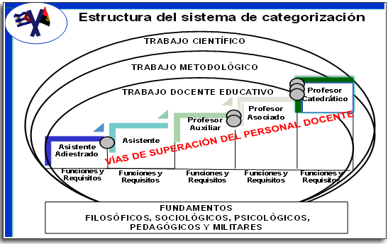 Por lo que, el sistema de categorización docente que se propone se basa fundamentos filosóficos, sociológicos, psicológicos, pedagógicos y militares con la tendencia de transformar los cambios cuantitativos en cualitativos y llegar a niveles superiores de perfeccionamiento educacional, pero sin negar los logros de los estadios precedentes. Teniendo en cuenta al conocimiento como un proceso y en circunstancias de interacción social entre los sujetos que participan en la actividad pedagógica, de manera que el aprendizaje exprese una esencia profundamente social.