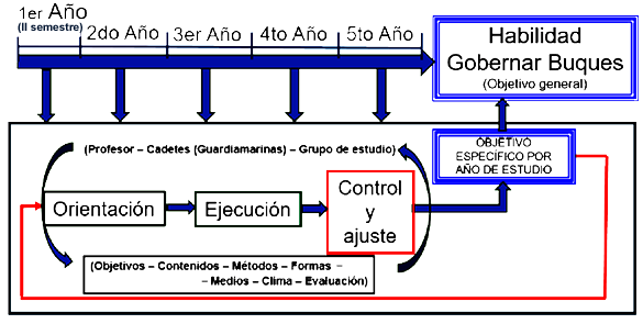 La estructura más general que se reconoce en la actividad de asimilación y sus tres componentes funcionales son: la parte orientadora, la ejecutora, y la de control y ajuste, que se manifiestan en cualquier tipo de actividad humana y que van a servir de hilo conductor para conformar en el modelo didáctico la formación de la habilidad gobernar buques, como el proceso de formación de una habilidad se debe llevar a cabo por momentos progresivos, es importante programar e intencionar momentos y etapas por años de estudio, para concebir una formación de la habilidad que se quiere alcanzar por habilidades de menor nivel de complejidad, y estas, a su vez, por acciones y operaciones que para este propósito deben tener en cuenta el tipo de embarcación y el equipamiento existente a bordo.