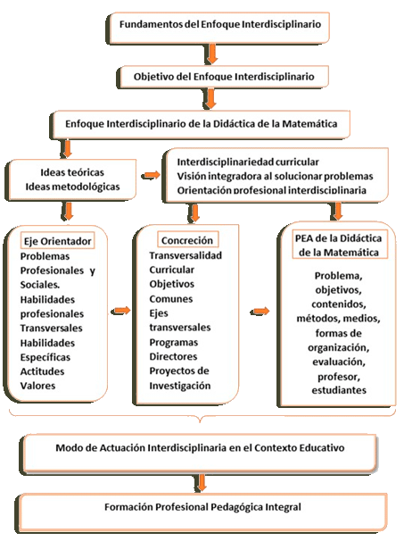 Las asignaturas de Didáctica de la Matemática, desde este enfoque interdisciplinario, conciben las interconexiones intradisciplinarias con el resto de las disciplinas matemáticas e interdisciplinarias con otras disciplinas académicas y ramas de la cultura desde problemáticas y objetivos comunes al proceso de profesionalización pedagógica integral. Esto conlleva a ir más allá de relaciones entre materias vinculadas sólo al contenido entre diferentes disciplinas y replantearse direccionar el proceso formativo hacia el fomento y desarrollo de un sistema de conocimientos, habilidades y actitudes profesionales con un carácter transversal que le permita con eficiencia superar los problemas de su profesión desde una perspectiva integradora. De acuerdo con los programas de la disciplina y las asignaturas, la Didáctica de la Matemática debe lograr en los profesores en formación, aprendizajes en los fundamentos de la matemática y los fundamentos didácticos y psicopedagógicos para su enseñanza en el nivel medio. La convergencia armoniosa entre estos aprendizajes y otros imprescindibles de la profesión, van conformando el sistema de contenidos de apropiación e interiorización necesarios para encauzar el proceso de enseñanza aprendizaje de la Matemática en el currículo escolar