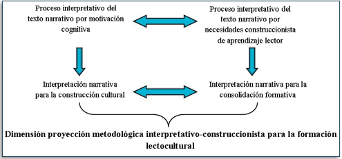 De esta manera, el profesor ha generado la disposición para elaborar y utilizar situaciones comunicativas, que se materializan en el texto que selecciona de manera práctica, para sustentar el aprendizaje y la formación integral. Es muy importante que los textos incluidos reflejen la diversidad temática, las expectativas, saberes previos y necesidades de aprendizaje de los estudiantes, al tiempo que se reconocen las perspectivas de formación, de todo lo cual emergen el Proceso interpretativo del texto narrativo para la consolidación formativa: refleja la visión cultural del estudiante, configurado con buenos modales, la expresión de actitudes, valores, hábitos y conductas que lo comprometen con la actuación social. Estos subprocesos dan cuenta de que, en esta lógica de modelación, el proceso de enseñanza-aprendizaje de la lectocomunicación se enriquece y transforma, de modo que se configura una dimensión didáctico-metodológica, expresión del proceso que en el tiempo se transforma declarada como la Dimensión proyección metodológica interpretativo-construccionista para la formación lectocultural del futuro Licenciado de la carrera Gestión sociocultural para el desarrollo. La lógica, anteriormente explicada, queda representada gráficamente de la manera siguiente