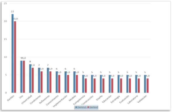 Como se aprecia se identificaron 16 términos, recurrentes en las fuentes investigadas desde diversidad de posiciones, pero en todas se constata la relación que establecen con técnicas, categorías o términos asociados a las Ciencias Pedagógicas develándose de manera significativa, la Didáctica y la resignificación de sus categorías y relaciones al interactuar con la Pedagogía, la Psicología y con las Ciencias Sociales, Económicas, de Dirección e Informáticas.