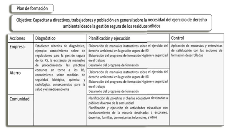 En función de intervenir en la realidad educativa y sociocomunitaria se tienen en cuenta los aportes de López, A. (2021) acerca de los tipos de resultados científicos y dada la complejidad que implica el ejercicio del derecho ambiental en la gestión de residuos sólidos y la necesidad de la formación constante de los recursos humanos y el desarrollo en estas de nuevas competencias; la empresa EISAL-EP, responde mediante un plan de formación que sea útil para el empleado y le ayude a mejorar el desempeño de su actividad.