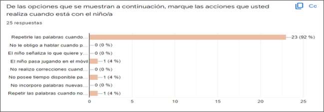 Con respecto a las acciones que realiza el padre de familia cuando está con el niño/a se evidencia los siguientes enunciados y porcentajes del cuadro, no obstante, es importante señalar que los primeros años de vida son cruciales para el desarrollo del lenguaje y otras áreas de aprendizaje en los niños debido a que se encuentran en un periodo de plasticidad cerebral, es decir a medida que se les estimulen los niños irán adquiriendo de forma rápida el aprendizaje.