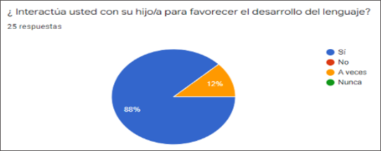 Además de los 25 padres encuestados el 88% de ellos respondieron que interactúan en conversaciones con sus hijos para favorecer el desarrollo del lenguaje, mientras que el 12% de ellos lo hace a veces.