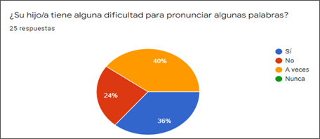 Así mismo se revela que el 40 % de padres expresan que sus hijos a veces presentan dificultades para pronunciar de forma correcta algunas palabras, por otro lado, el 36% de ellos reconocen que sus hijos si presentan dificultades para la pronunciación de ciertas palabras, mientras que el 24% de ellos responden que sus hijos no padecen de ninguna dificultad para la pronunciación.