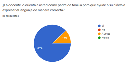 Por otra parte se evidencia que de los 25 padres de familia el 88% de ellos manifiestan que la docente brinda las orientaciones necesarias que ayudan al desarrollo del lenguaje de los niños, mientras que el 12% de ellos expresa que la docente lo hace solo a veces, es por tanto que la docente debe explicar claramente a la familia el porqué, para qué y con qué recurso realizar la actividad para estimular el desarrollo del lenguaje considerando que la familia es un agente mediador en la educación de los niños.