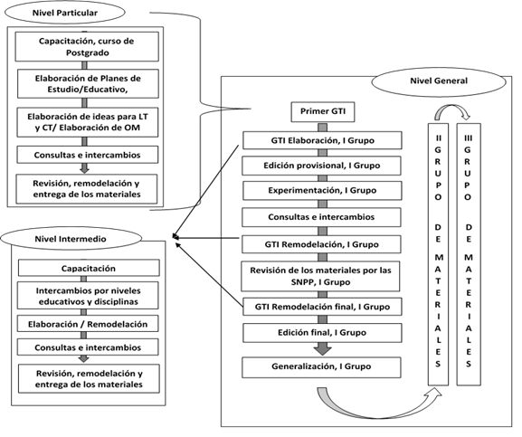El nivel Particular se refiere al I Grupo de Trabajo Intensivo, el cual constituye núcleo esencial de todo el diseño del currículo general. El nivel Intermedio está relacionado con las acciones que se desarrollan en cada GTI convocado durante la elaboración de los materiales. El nivel General tiene en cuenta el proceso más abarcador, es decir, las acciones por las que se debe transitar una vez vencido el I GTI hasta la Generalización del empleo de los materiales elaborados.