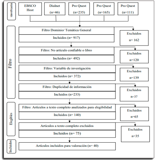 En la Figura 2, se observa que, de la revisión sistemática realizada en las bases de datos: Google Académico, EBSCO, ProQuest, SciELO, y Dialnet, se lograron obtener 40 artículos de interés para la investigación.