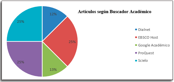 En cuanto a la cantidad de artículos extraídos por cada fuente, se tienen un total de 5 (13%) de Google Académico; EBSCO Host con 10 (25%), de ProQuest 10 (25%), 5(12%) de Dialnet y 10 (25%) de SciELO.