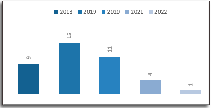 En la Figura 3, se observa que las fechas de publicación de las investigaciones en la mayoría de los artículos son del año 2019, con (15) artículos seleccionados, y en segundo lugar del año 2020 con (11) artículos seleccionados. Para el año 2018 fueron seleccionados (9) artículos, para el año 2021 (4) artículos y en el año 2022 (1) artículo.