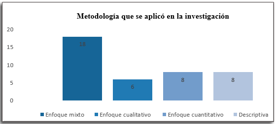 En la Figura 5, se observa que haciendo referencia a la metodología que se utilizó en las investigaciones encontradas, del total de los 40 artículos (18) investigaciones son de enfoque mixtos y diseño cuasi experimental, utilizando como instrumentos el Test de Pensamiento Creativo de Torrance, mientras que (8) artículos son de metodología descriptiva y aplicaron como instrumentos cuestionarios, (6) estudios han sido cualitativa utilizando como instrumento la guía de análisis documental y (8) artículos son de enfoque cuantitativo y utilizan como instrumento cuestionarios.