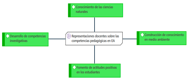 Acerca de las representaciones docentes sobre las competencias pedagógicas en educación ambiental se enmarcan en la adquisición de las habilidades y conocimiento para cambiar la manera pensar del estudiante y conseguir un estilo de vida responsable en el manejo de los recursos medioambientales. Por consiguiente, estas aptitudes pedagógicas fortalecen el carácter para afrontar los problemas. Las competencias pedagógicas utilizadas por los profesores para confrontar esta problemática ambiental son: conocimiento de las ciencias naturales, desarrollo de competencias investigativas en los estudiantes, construcción de conocimiento en medio ambiente y fomento de actitudes positivas en los estudiantes. A continuación, se mostrarán la teorización de resultados para cada una de estas categorías.