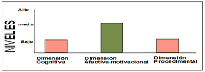 Las derivaciones logradas con la aplicación de diversos instrumentos, permitieron constatar que en las dimensiones cognitiva y procedimental los docentes tienen un bajo nivel de preparación. Resultado diferente se logró en la dimensión afectivo-motivacional, en la que los indicadores se evalúan en un nivel medio, aspecto importante a los efectos de los objetivos de la investigación. Tal como se expresa en el gráfico 1.