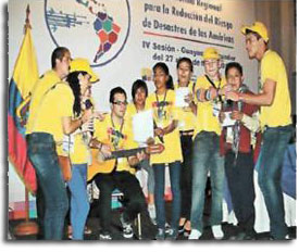 El proyecto ha brindado oportunidades a los docentes y estudiantes a exponer sus experiencias, vivencias y buenas prácticas en eventos científicos internacionales como por ejemplo: el 1er Taller Regional para la Reducción de Desastres, el congreso internacional de Pedagogía y en la plataforma regional para la Reducción de Riesgos de Desastres, efectuada en Guayaquil, Ecuador 2014. La foto muestra la participación de los estudiantes en la plataforma regional, niña de la comunidad Casilda del municipio Trinidad y el estudiante de la comunidad de Agabama del municipio Fomento, ambos de la provincia de Sancti Spíritus. |
