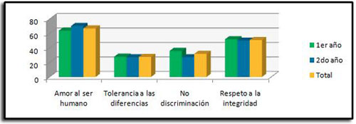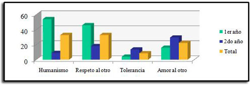 Como se observa los resultados indican un pobre conocimiento de los rasgos esenciales del valor humanismo. La tolerancia a las diferencias y la ausencia de discriminación de cualquier índole, que fueron identificados por un porciento minoritario de estudiantes (27,6%, 31,9% respectivamente), son rasgos que unidos a la apertura al diálogo, el respeto y la solidaridad, entre otros, definen la esencia humanista de los individuos. Dado que el conocimiento es la antesala del actuar consciente, y es además (junto a las esferas: afectivo volitiva y orientación ideológica) uno de los componentes esenciales para la existencia de un valor, la pobre existencia del mismo en el grupo de estudiantes nos sitúa ante dificultades en el estado de este valor ético. Estas dificultades han sido propuestas como objeto de estudio de una investigación ulterior.