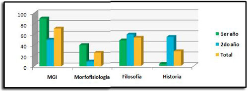 En el caso de Filosofía I y II, de once temas a desarrollar solo en tres de ellos se explicita el tratamiento del humanismo o sus rasgos. En Psicología Médica de tres temas a abordar, en los tres se explicita tratamiento de rasgos del humanismo. En Historia de Cuba I y II, no se explicita tratamiento del humanismo y sus rasgos en ninguno de los temas a abordar. O sea, se constata que solo en el 60% de las asignaturas de Ciencias Sociales y Humanísticas que componen en Plan de estudios de la especialidad de Medicina en el primer ciclo de carrera, se orientan de forma explícita contenidos relacionados con el humanismo o sus rasgos, algunos de los cuales se constituyen en objetivos generales o específicos a vencer por los estudiantes. En el caso de la Historia de Cuba, en la fundamentación de la disciplina se exponen claramente las aspiraciones de contribución a la formación humanista de estudiantes.