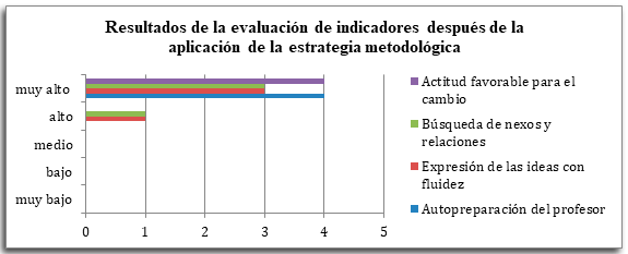 Se logran excelentes resultados vinculado con la actitud favorable al cambio mediante la utilización de métodos de enseñanza activos, se establecen espacios para la búsqueda de nexos y relaciones interdisciplinarias, se favorece la expresión de los resultados docentes con mayor fluidez y se logra elevar los espacios de autopreparación del profesor lo cual conduce a concebir el proceso educativos desde una perspectiva desarrolladora, por lo cual se corrobora la validez y pertinencia de la estrategia metodológica.