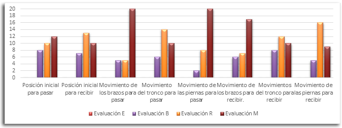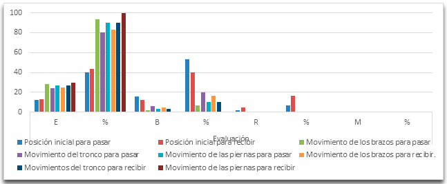 En función del diagnóstico a la muestra se aplicó una guía de observación como instrumento, a partir de los indicadores fundamentales establecidos para determinar las principales deficiencias existentes en la ejecución del pase y la recepción por parte de los estudiantes. Cada indicador fue evaluado con criterios de excelente (E), bien (B), regular (R) y mal (M). En la tabla 1 se muestran de forma cuantitativa los principales resultados obtenidos y en la figura 1 se grafican.