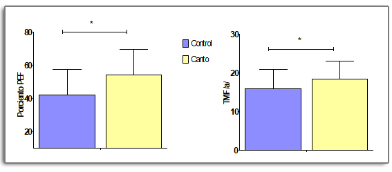 En el grupo experimental: la FVC 50,1±17,3 al inicio vs 59,37±15,7; p=0,000419. El PEF se tuvo una modificación positiva luego de la aplicación del canto coral de 44,2±15,1 al inicio vs 54,2±15,4; p=0,000196. Los tiempos máximos de fonación con /s/ y con /a/ tuvieron modificaciones el TMF /s/ de 12,9±6,5 al inicio vs 18,1±6,6; p=0,000494, el TMF/a/ de 12,24±4,7 al inicio vs 18,3±48; p=0,000293.