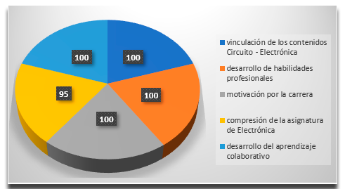 Análisis e interpretación: El 100 % de los estudiantes plantean que la vinculación de las asignaturas de circuitos con electrónica, así como el empleo de software que les permite realizar simulaciones, los ayudó a mejorar el interés y motivación por la carrera, pues además de los conocimientos teórico-prácticos adquiridos en las actividades teóricas, estos también son aplicados a casos de estudios reales de la profesión como por ejemplo el diseño de circuitos eléctricos analógicos con el empleo de amplificadores operacionales.