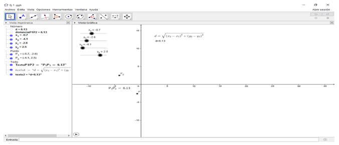 Ejemplo 1: Comprueba, utilizando las herramientas de GeoGebra, que la distancia entre dos puntos del plano puede calcularse mediante la fórmula: