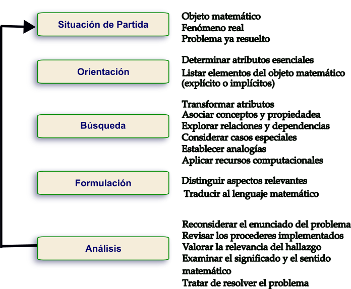 En la representación que ilustra la figura 1, los autores antes mencionados han tenido en cuenta que el proceso de planteo de un problema no posee en general una estructura lineal, por lo que el sentido de las saetas pretende hacer visible que, en cada fase, se puede avanzar a la próxima o incluso a otra más adelante en la que se puede estar trabajando simultáneamente, o retroceder a la fase inmediata anterior o incluso a otra anterior, sin que al retroceder ello implique que haya que ejecutar todas las acciones que aparecen dentro de dicha fase, sino solo la(s) que interesa volver a realizar. La saeta que conecta la última fase con la situación de partida indica que, a partir de la experiencia obtenida pueden surgir nuevas ideas, acerca de otros problemas que se pueden generar o bien que el problema planteado no responde a las expectativas y se requiere comenzar de nuevo el proceso.