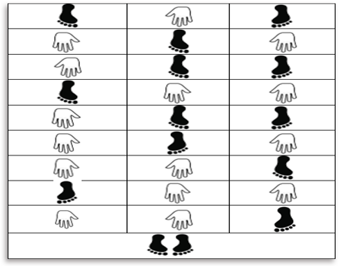 Orientación- instrucción: Fíjate en las plantillas que aparecen en el suelo cada una representa tus dos manos y tus dos pies. Atrévete a ponerlos en esa posición de un solo salto cada vez.