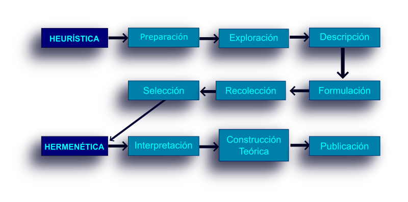 En un segundo momento de la investigación, el investigador se apoyó la búsqueda de respuestas a partir de la utilización de la hermenéusis y la heurística, para el importante proceso de comprensión y explicación de las carencias explicitadas anteriormente, de indagación y descubrimiento, pero además como fases de significado y sentido del propio proceso de logro del Estado del Arte; ya que le son inherentes en tanto permiten su existencia como herramienta metodológica.