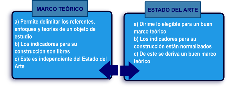 Si por una parte, en sentido práctico, los indicadores para la construcción de la del marco teórico son generalmente libres, los del Estado del Arte están normalizados, y entre uno y otro se aprecia desde esta perspectiva, hay una relación de subordinación, una relación visible, en la medida que podamos organizar e integrar una buena búsqueda, selección bibliográfica, en el que la interdependencia entre uno y otro tributará a que esas fuentes bibliográficas sean validadas no solo por plantas académicas, sino por sistemas de publicación de Ciencia.