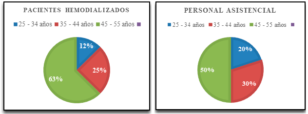 La muestra estuvo conformada por 8 pacientes hemodializados y 8 participantes en el rol de personal asistencial. La distribución de edades en la muestra apunta a que la mayoría de los participantes hemodializados (63%) se encuentran en la etapa media de la vida, entre 45-55 años. Esto indica que la enfermedad renal crónica puede ser más común en esta etapa de la vida, cuando los individuos pueden estar más propensos a desarrollar condiciones médicas crónicas. La presencia de un participante más joven (25-34 años) y dos participantes de mayor edad (35-44 años) sugiere que la enfermedad renal crónica puede afectar a individuos de diferentes edades (ver Figura 1). Estos resultados implican la necesidad de un diseño que comprenda las relaciones intergeneracionales y los sustentos teóricos psicoeducativos correspondientes.