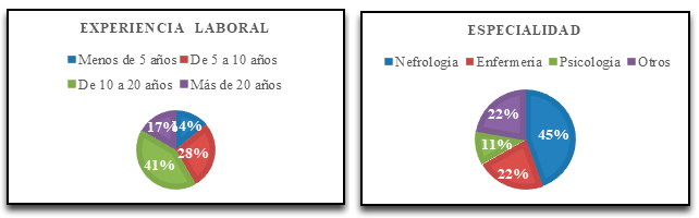La mayoría de los participantes con especialidad en nefrología indica que la especialidad es un factor importante en la composición del personal asistencial en el cuidado de pacientes con enfermedad renal crónica. La presencia de participantes con especialidades en enfermería y psicología permite inferir que la atención al paciente con enfermedad renal crónica requiere una aproximación interdisciplinaria y que los profesionales de la salud deben trabajar en equipo para proporcionar una atención integral al paciente. Además, se recomienda incluir a otros especialistas relacionados con el cuidado físico, el diseño y la innovación pedagógica, así como la orientación educativa.