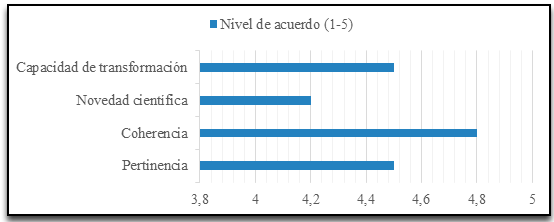 La composición del panel de expertos garantizó una diversidad de perspectivas y experiencias, lo que permitió una evaluación exhaustiva y objetiva del sistema de talleres. Los expertos evaluaron el sistema de talleres según los criterios preestablecidos. En tal sentido, la figura 5 muestra que los expertos consideraron que el sistema es pertinente (4.5) y coherente (4.8) en su enfoque para abordar el afrontamiento del paciente con enfermedad renal crónica y su preparación para iniciar el tratamiento hemodialítico. Esto sugiere que el sistema de talleres se ajusta a las necesidades específicas de los pacientes con enfermedad renal crónica y que sus componentes están bien integrados y lógicamente relacionados.