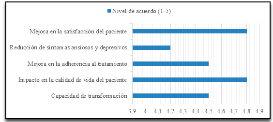 Por otro lado, la figura 6 muestra que los expertos consideraron que el sistema de talleres tiene un alto nivel de capacidad para transformar el contexto de estudio (4.5). Esto se refleja en la capacidad del sistema para mejorar la calidad de vida del paciente (4.8), la adherencia al tratamiento (4.5) y reducir la ansiedad y la depresión (4.2).