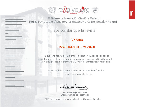 El 6 de marzo de 2015, en Toluca, México, el Sistema de Información Científica Redalyc Red de Revistas Científicas de América Latina y el Caribe, España y Portugal, derivado de la evaluación realizada a la revista Varona por el Comité Científico Asesor de Redalyc, determinó por unanimidad su inclusión en su acervo, dado que cumple los criterios de calidad editorial y de contenido requeridos. Tanto para la revista en soporte papel, con ISSN 0864-196X, como para la versión electrónica, con ISSN 1992-8238.