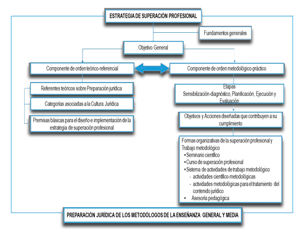 Asimismo, contempla las categorías asociadas a la cultura jurídica: educación jurídica, formación ciudadana, civismo, conciencia jurídica, comprensión de lo jurídico, entre otros. En la estrategia de superación profesional, se declaran como premisas básicas: