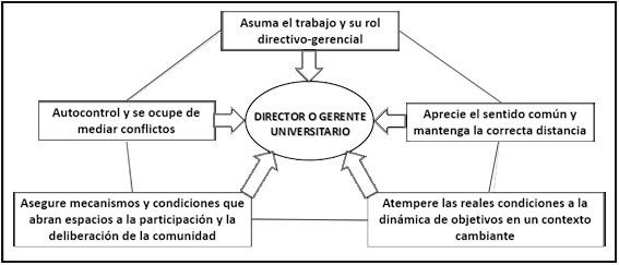 Esta propuesta es el principio aproximativo de las 5A aportado por la autora, que describe las expectativas que como regularidad manifiesta la comunidad universitaria para con su directivo o gerente, a la vez que se establecen algunas de las formas de enfrentar los retos que esta percepción le impone al mismo (Ver figura 1).