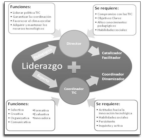 Figura 2. Funciones y roles del líder en sus desdoblamientos como director, coordinador, experto y mediador pedagógico.