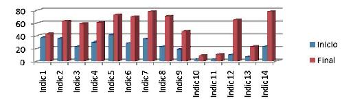 Los indicadores que más se destacaron fueron el 5, 7, 14; a continuación, se exponen en la (Fig. 2), con un análisis cuantitativo del rendimiento de los 90 niños y adolescentes de la muestra estudiada en el estado inicial y final de este primer corte evaluativo.